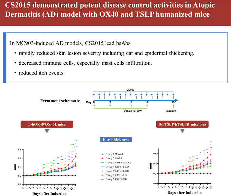 CS2015在OX40和TSLP人源化小鼠的特应性皮炎(AD)模型中,展现出强大的疾病控制能力。在MC903诱导的AD模型中,CS2015先导分子能够: