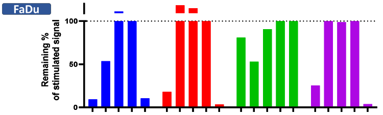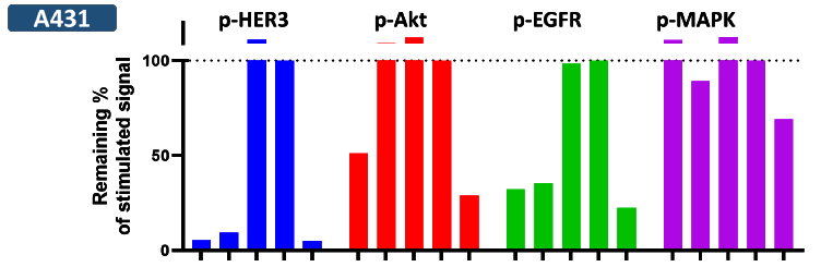 通过蛋白免疫印迹法(Western Blots),在由双靶点配体(TGF-α/EGF与NRG1β1)模拟的持续刺激微环境中,评估了CS5007的裸抗J17对不同人肿瘤细胞系的信号阻断能力。J17能够通过双重靶向EGFR和HER3,实现对下游信号通路(包括Akt和MAPK通路)的强效抑制作用。相比于BL-B01D1的裸抗SI-B001,J17具有更优越的药效学特征:实验显示,在A431和FaDu细胞中,SI-B001无法有效阻断HER3/Akt信号,J17能凭借其特有的双重阻断机制克服单靶点局限,表现出极佳的抑制活性。
