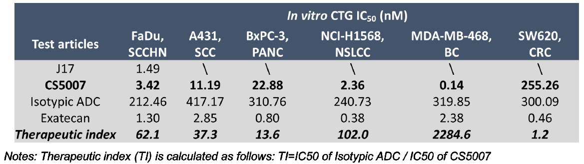 注:治疗指数(TI)的计算公式如下:TI=同型对照ADC的IC50/CS5007的IC50