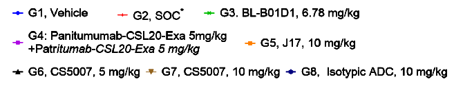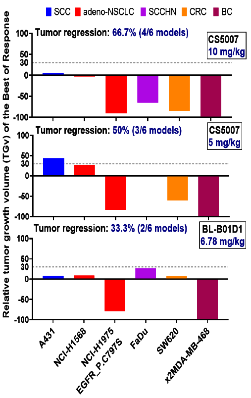 注:1)BL-B01D1,为根据公开文献数据合成的参考分子,采购于MCE。2)BL-B01D1的剂量设定为6.78 mg/kg(除了在FaDu模型中给药剂量为5 mg/kg),以确保其与10 mg/kg CS5007所携带的有效载荷具有相同的摩尔数。3)通过根据以下公式计算相对肿瘤生长体积(TGv,%)来评估抗肿瘤活性:如果在TGv计算日,治疗组小鼠的平均肿瘤体积小于给药时(Ti<T0),则TGv(%)=100×(Ti-T0)/T0;如果不是,则TGv(%)=100×(Ti-T0)/(Vi-V0),其中Ti和Vi分别是TGv计算日治疗组和溶媒对照组的平均肿瘤体积;T0和V0分别是给药时治疗组和溶媒对照组的平均肿瘤体积。根据该公式,我们将TGv<0定义为肿瘤消退。4)所展示的数据为第1周期治疗(7天)后的汇总最佳疗效。