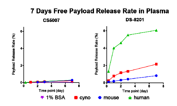 CS5007在体外血浆稳定性测试中表现优异,其稳定性优于DS-8201(德曲妥珠单抗)。在血浆中孵育7天后,其游离载荷的释放率低于0.5%,降低了脱靶毒性风险。