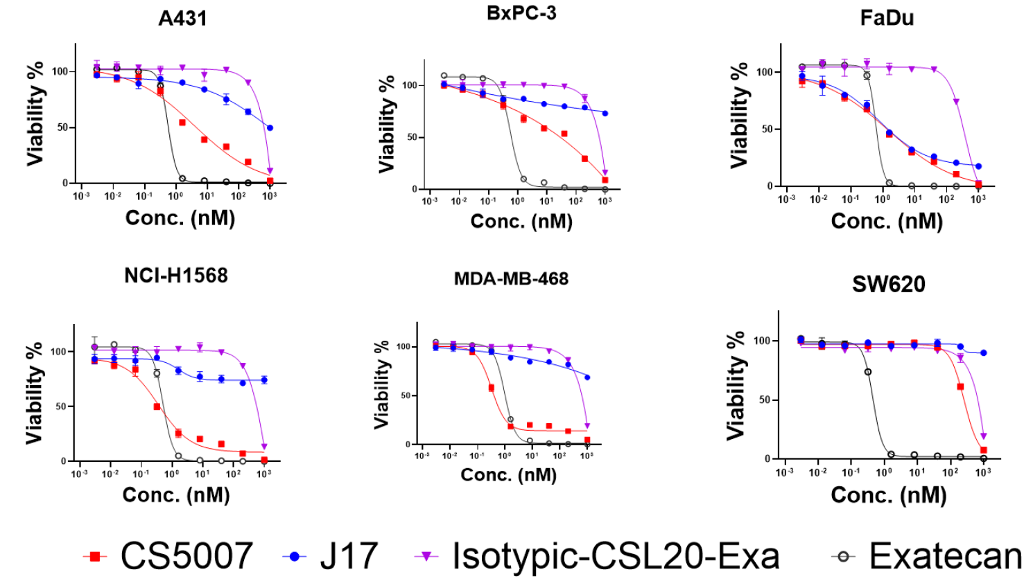 采用CellTiter-Glo®(CTG)发光法评价了CS5007对6种人肿瘤细胞系的体外增殖抑制作用。实验证实,其在包括非小细胞肺癌(NSCLC)、鳞状细胞癌(SCC)、结直肠癌(CRC)、头颈鳞癌(SCCHN)、胰腺癌(PANC)、及乳腺癌(BC)多种肿瘤细胞系中均表现出纳摩尔级别的强效细胞杀伤活性,且呈抗原依赖性。