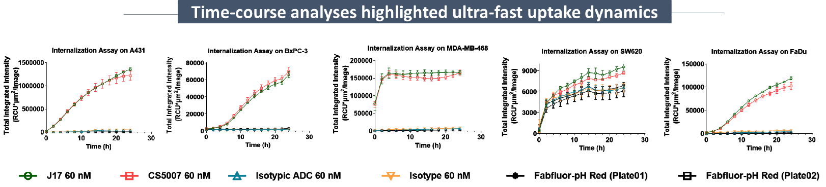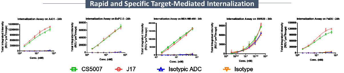 基于Incucyte®活细胞成像评价显示,CS5007在多种肿瘤细胞系中均表现出与裸抗J17一致的靶点介导内化特征:呈浓度依赖性快速被摄取并高效进入溶酶体(阴性对照均无信号)。具体而言,其内化起效极快(在MDA-MB-468细胞中0小时即有信号,4小时达峰);且即使在EGFR低表达细胞(SW620)中,CS5007仍能通过HER3介导实现快速内化,依然保持了高效的药物递送能力。