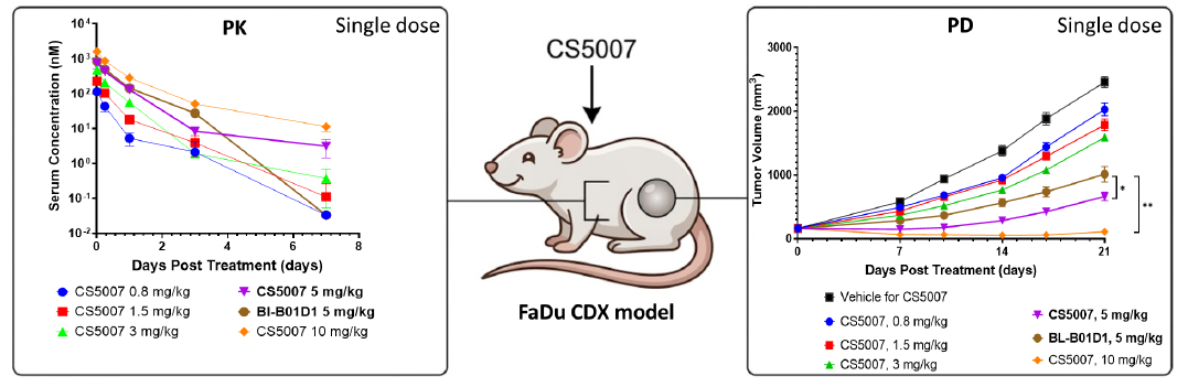 在小鼠模型中,CS5007展现出优于BL-B01D1的药代动力学(PK)/药效动力学(PD)特征: