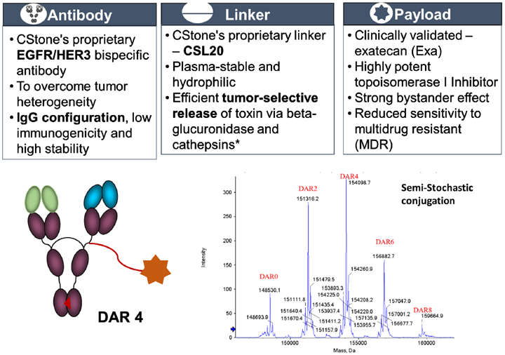 CS5007是一种双特异性ADC,由抗EGFR/HER3人源IgG1抗体、基石药业专有的亲水性CSL20连接子,以及临床验证的拓扑异构酶I抑制剂Exatecan组成。该药物采用半随机偶联将连接子载荷与抗体结合,其平均药物抗体比(DAR)约为4。