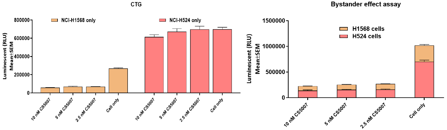 通过结合CTG与FCM(流式细胞术)分析,研究证实了CS5007具备卓越的旁观者杀伤效应。在单独孵育体系的CTG检测结果显示,CS5007对靶抗原阳性的NCI-H1568肿瘤细胞具有强效且呈浓度依赖的细胞毒性,而对抗原阴性的NCI-H524细胞无明显杀伤作用。在单培养体系中,CS5007可对H1568细胞产生细胞毒性,而对HCI‑H524细胞无杀伤作用。在进一步构建的共孵育体系中,FCM的精确定量分析表明,CS5007在靶向杀伤阳性细胞(NCI-H1568)的同时,能够有效导致共同孵育的抗原阴性细胞(NCI-H524)死亡。这一特性使其能够有效应对实体瘤内部靶抗原表达的空间异质性挑战。