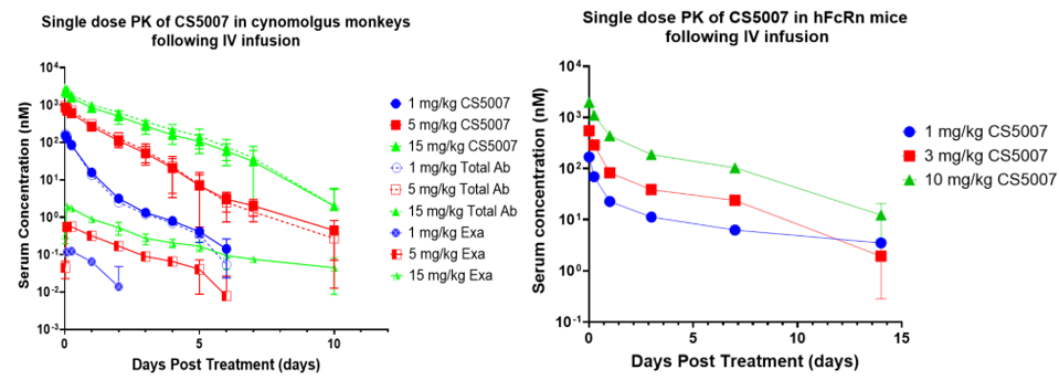 在非人灵长类动物(NHPs)中,CS5007表现出与同类EGFR靶向药物一致的良好代谢稳定性,半衰期约2天,与报道的EGFR靶向的抗体或ADC在NHP中的PK相当。在人源FcRn转基因小鼠中,半衰期约2.5-8天。
